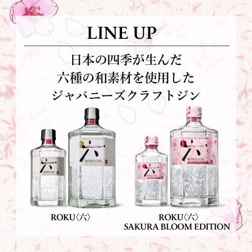 味わい:柔らかく滑らかなトップノートは、ほのかに甘く、エレガント。 桜餅の塩味と花見の華やかさが感じられ、ROKU〈六〉の四季の和素材が織りなす繊細な調和が際立つ。